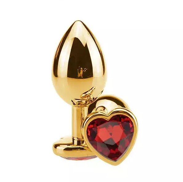 Plug em metal dourado em formato de coração com pedra vermelha. Excelente para descobrir novas experiências.