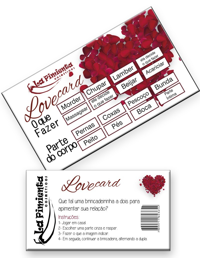 Raspadinha Love Card, trata-se de um jogo para brincar acompanhado, trazendo combinações de ações sensuais, aquecendo as preliminares. Raspe com o auxílio de uma moeda ou com a própria unha um quadradinho "o que fazer" com outro "parte do corpo" e inicie a brincadeira. Essa raspadinha é um jogo criado com o intuito de apimentar a relação.